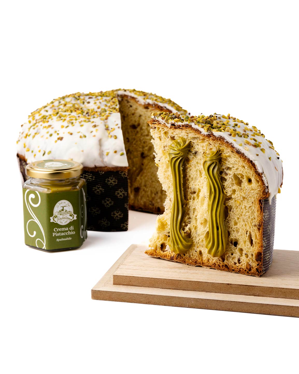 Il nostro pistacchioso panettone è dato dalla lievitazione naturale è ottenuto dopo 48 ore di lavorazione, la scelta di materie prime di prima qualità, compongono questa autentica opera d’arte: sofficissimo, profumato e soprattutto elegante, il panettone è farcito da granella di pistacchio siciliano. Ma il pezzo forte è la crema al pistacchio spalmabile di nostra produzione. La “cupola” è poi custodita da una glassa di cioccolato bianco e arricchita poi con granella di pistacchio rigorosamente schiacciata a mano. In sostanza uno spettacolo per gli occhi e un godimento per il palato.